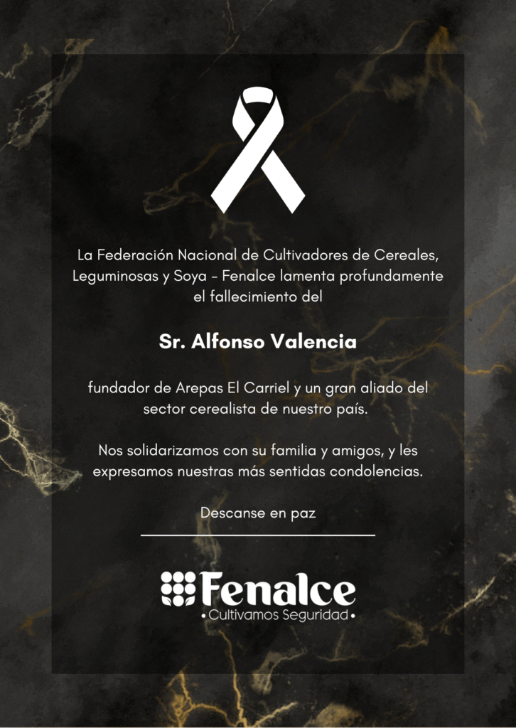 5 de noviembre de 2024. La Federación Nacional de Cultivadores de Cereales, Leguminosas y Soya – Fenalce, en cabeza de su gerente general Arnulfo Trujillo Díaz, lamenta profundamente el fallecimiento del señor Luis Alfonso Valencia, reconocido ganadero y fundador de la empresa Alimentos El Carriel. Luis Alfonso Valencia fue un gran aliado del sector cerealista […]