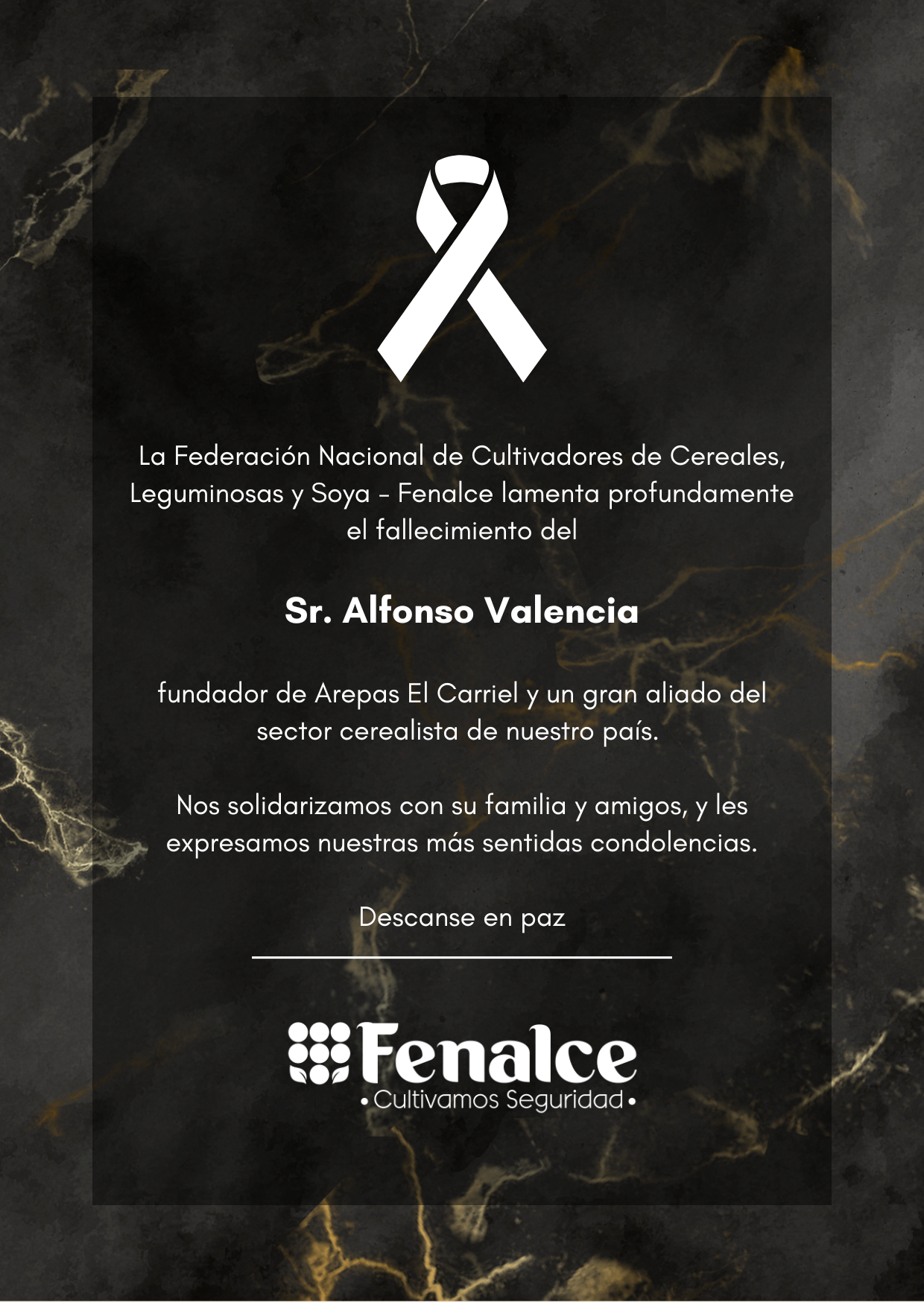 5 de noviembre de 2024. La Federación Nacional de Cultivadores de Cereales, Leguminosas y Soya – Fenalce, en cabeza de su gerente general Arnulfo Trujillo Díaz, lamenta profundamente el fallecimiento del señor Luis Alfonso Valencia, reconocido ganadero y fundador de la empresa Alimentos El Carriel.